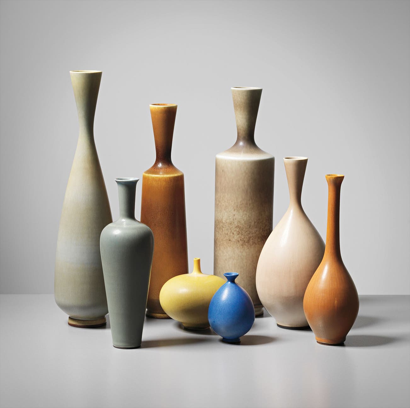 Produced by Gustavsberg, Sweden. Underside of four vases incised with manufacturer's mark and artist's signature Friberg, one with manufacturer's paper label GUSTAVSBERG SWEDEN and another impressed with manufacturer's marks.