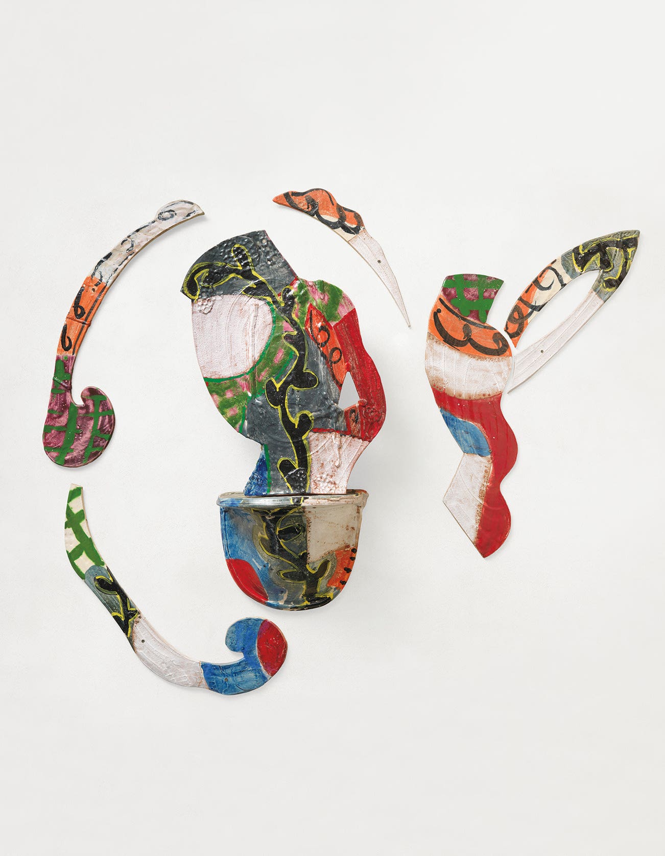The present work fuses the pictorial with the pot, a key exploration for Woodman. At first, it appears there is just one vessel at the center of the piece, a double-sided vase set upon a suspended shelf. But, another soon reveals itself in the surrounding cutouts, its handles outstretched. Still others emerge as suggestions, found within its negative space. Woodman’s work famously evokes the riches of art history. The patches of blue seen here could be borrowed from the skies of Pierre Bonnard; the mix of patterning could be drawn from Italian maiolica, Japanese kimonos, or Henri Matisse. The artist often described her ceramics as a 'marriage of painting and form'. This piece exemplifies her approach and the apparent ease with which she created it, a result of Woodman’s material mastery.