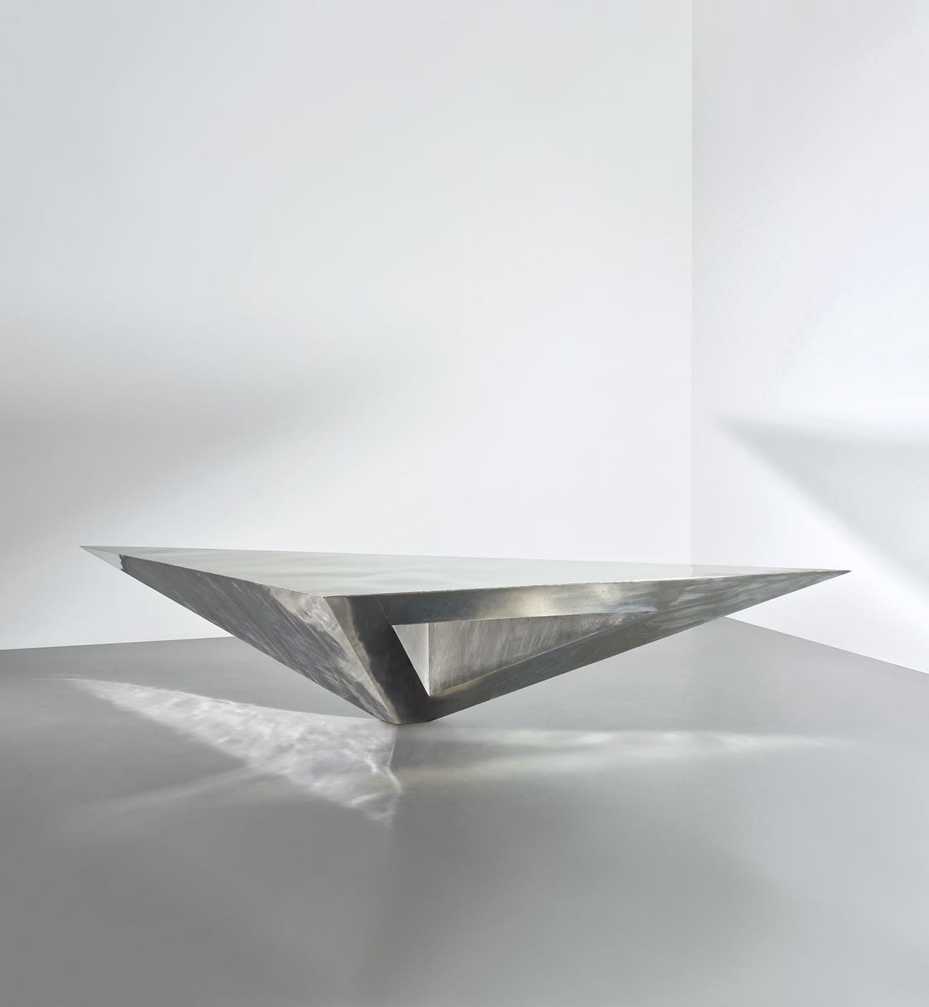 Pepper has explained the aesthetic experience she wished people to inhabit when approaching her work: ‘seeing, touching, and the physical sensory engagement is the way into my sculpture; my intention is that the meaning of my work rests in experiencing it.’ [2] The present lot is, likewise, emphatically multi-sensory. The table is comprised of smooth, polished stainless steel that mirrors a rippled abstraction of the room surrounding it. Its top is met by three additional triangular slabs of steel serving as the table’s base, which recede downward to a support made of steel-reinforced concrete. The support element is meant to hide underneath the floor, ensuring that the object appear weightless, with its impressive form seemingly balanced on a mere few centimetres. As a spectator approaches the work and walks around it, the planes and linear elements supporting the table top’s reflective surface suddenly appear then dissipate into voids. Characteristic of Pepper, there are unexpected textures in this work. In addition to the polished stainless steel, a triangular recess of brushed steel can be discovered within one of the table’s side panels. When the table was created, in the early 1970s, Pepper was at the height of her career. She had been experimenting with transitioning the forms of her enormous angular sculptures inset with triangular hollows, such as Perazim II (1975), into objects of utilitarian design, but the present lot is unique among Pepper’s already rare hybrid examples.