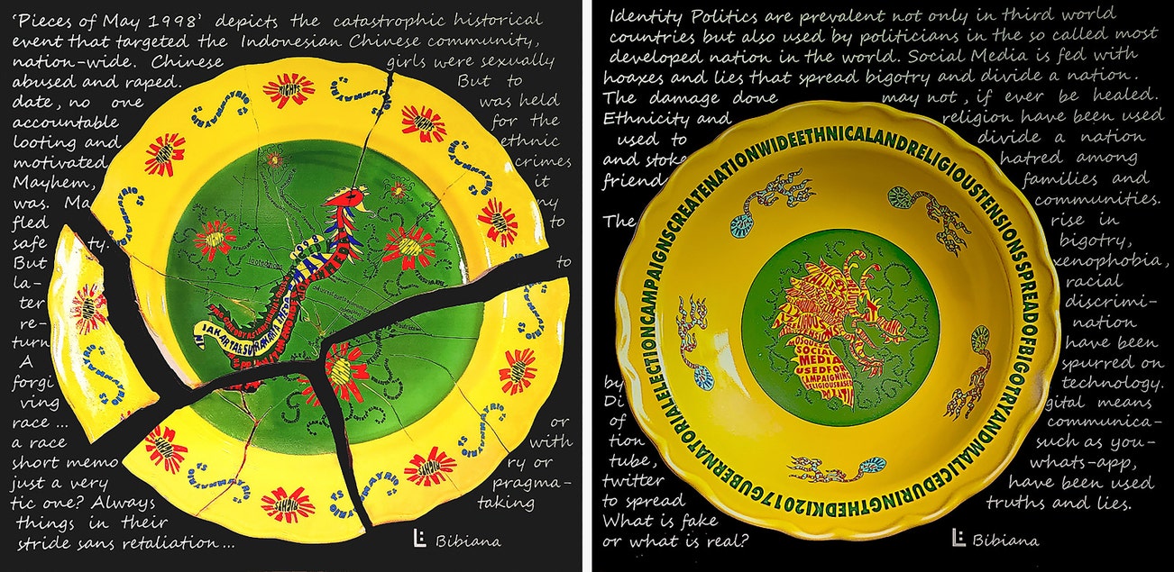 Lee is renowned for her documentation on porcelain of the history of Indonesian discrimination against ethnic Chinese from the 17th century until 2019. Inspired by personal observations, experiences and in-depth research, Lee translates these experiences into powerful visual art. Lee’s practice extends beyond porcelain, and her experimentation with different mediums has become a trademark of her work. This diversity in her practice has earned her several prestigious awards such as gaining an Honourable Mention by the Indonesian Heritage Society for the painting The Professionals II and becoming a finalist in the 2022 Erlangga Installation Competition through her use of the Augmented Reality (AR) technique.