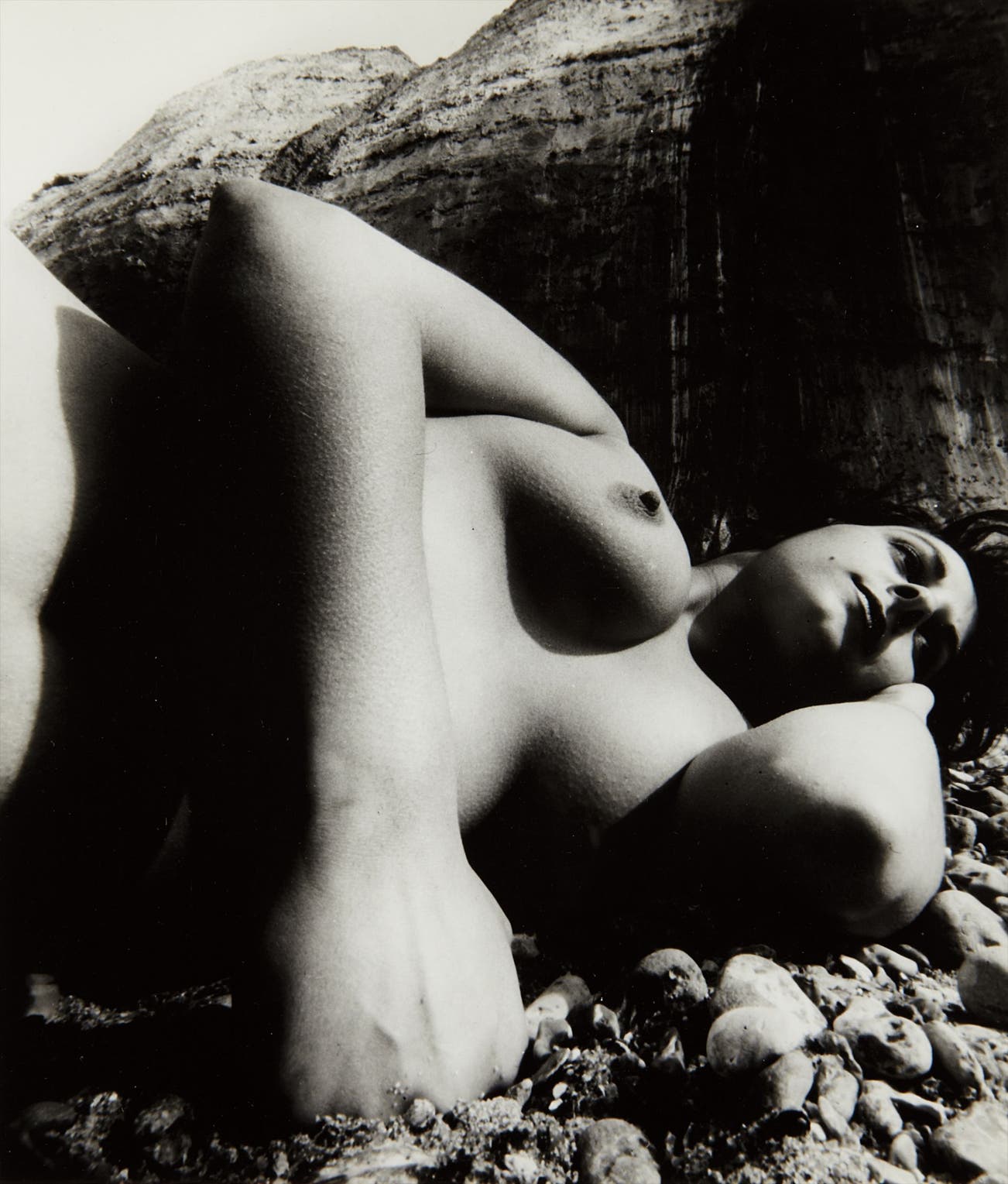 German-born Bill Brandt indisputably brought the British to a new understanding of their culture, heritage, and point of view. He started his career in Paris as a studio assistant for Man Ray, but he left his early exposure to surrealism unexplored until after establishing himself in the 1930s as England’s great photojournalist. A turning point came in Brandt’s work in 1944, when, directly following the Normandy invasion, he purchased a wideangle lens camera used by the police to document crime scenes; with this new equipment, Brandt left behind his keenly observed documentation of English public society and turned inward, to strange and wonderful portrayals of the female nude set in private--or nearly claustrophobic--interiors. His earliest nudes, taken indoors, presenting the models as beautiful aliens, strangely situated on chairs or suggestively positioned in front of recently inhabited beds, with white flesh ethereally lit by large windows or doors left ajar. Over time Brandt moved his camera almost unbearably closer, abstracting the body until it flooded the lens, conjuring fleshy fields with the enormity of an English landscape. Eventually Brandt took a Superwide Hasselblad camera out of doors, travelling to the edge of the sea. There, amongst the rocks and pebbles, the metamorphosis of Brandt’s nudes was complete.
