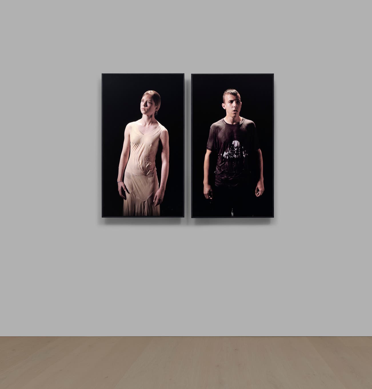 color high-definition video diptych on plasma displays mounted vertically on wall