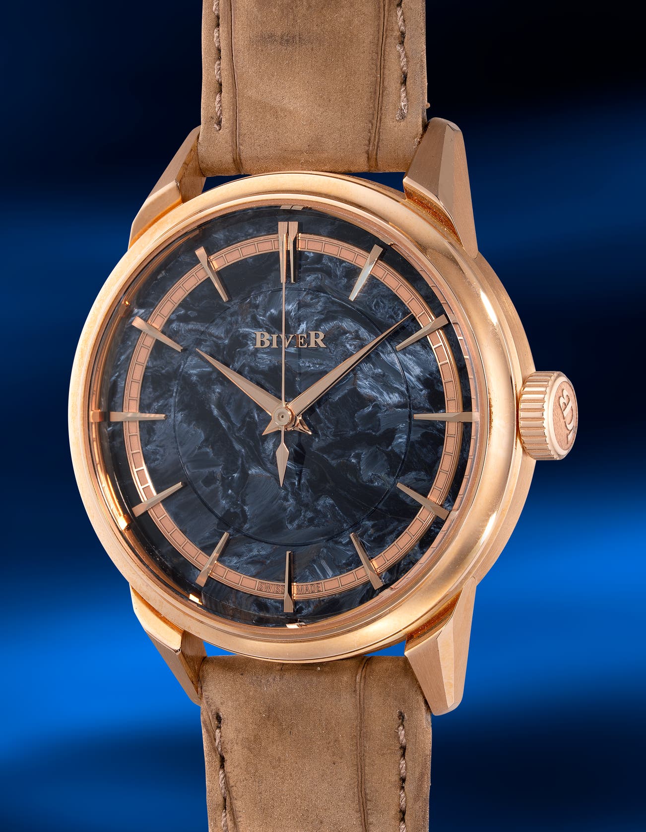 - In this iteration, a deep blue Pietersite dial—streaked with white and orange—harmonizes with the warm tones of the 18K rose gold case and hands. Each stone is meticulously shaped, allowing the applied indices and hands to appear as if floating above its textured, three-dimensional surface.