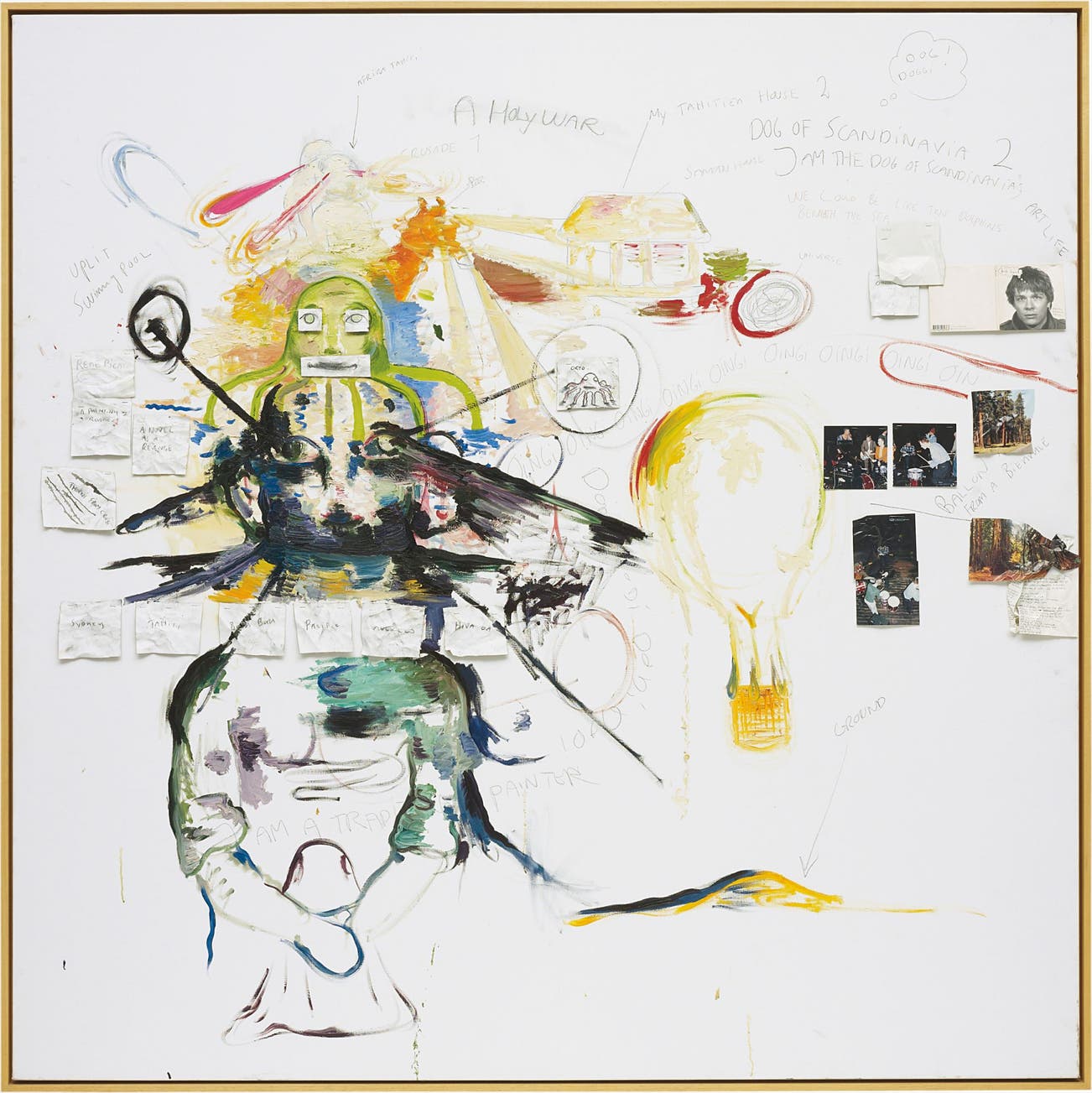 oil paint, stapled canvas sections, charcoal, coloured pencil, graphite, cd cover and booklet on canvas