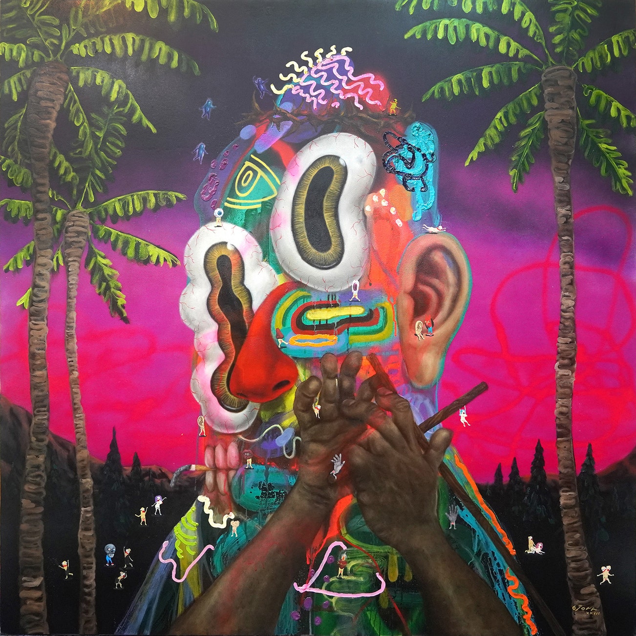 Forgiveness is typical of the vibrant and surreal scenes created by leading Filipino artist Bjorn Calleja. In these scenes, perspective and scale are consciously altered. Employing a fluorescent palette, he constructs forms that are both familiar and abstract. Here, an abstracted central figure is depicted with enlarged facial features, and the canvas is also populated with miniature cartoonish characters, which are a central unifying motif throughout his recent works. This upended sense of scale serves as a metaphor that interrogates the impact humans have on the world around them and examines how we are responsible for shaping our environment.
