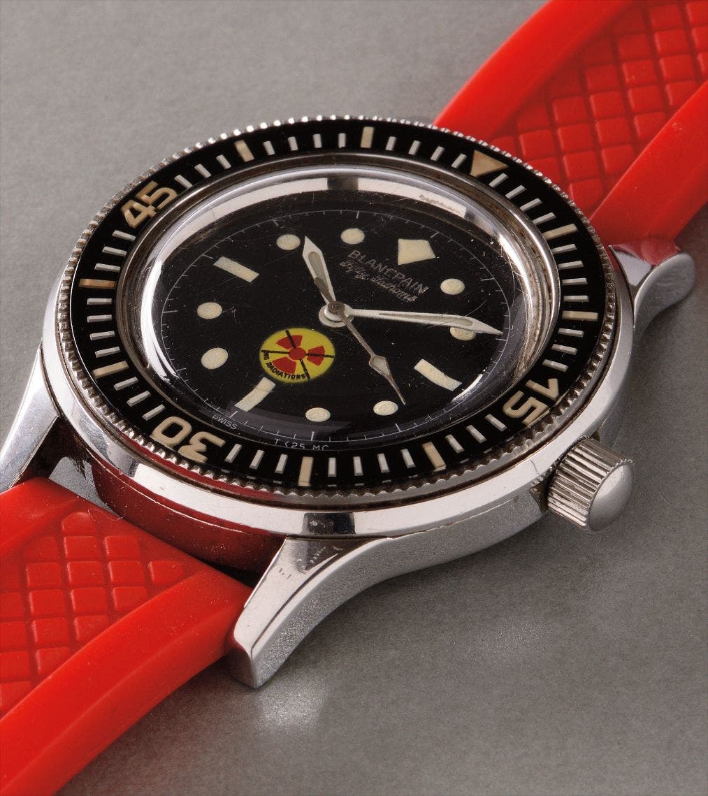 The present example was made for the German military, and as expected from a watch that was worn during military service, the case back is worn but the Bundeswehr inscription along with the 13 digit NATO stock number : 6645-12-149-5012 is still highly legible. Fitted with its original ‘No Radiations’ dial, it was used during the 1960s when there was growing concern over the use of radioactive luminous material. Interestingly, the Fifty Fathoms made for the Bundeswehr are believed to be the only military-issued versions to feature such No Radiations dials. A very rare and attractive variant of the famous Fifty Fathoms that offers tremendous value for the collector.