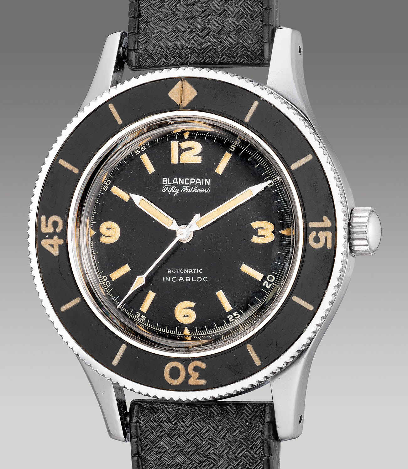 The present Blancpain Fifty Fathoms has an early case number and the beautiful 3 / 6 / 9 / 12 dial layout typical of Fifty Fathoms and Aqua-Lungs of the era, with puffy luminous material that has aged beautifully over time, an exceptionally well-preserved case, and a perfectly intact Bakelite bezel. Correct for an early, pre-1960s example, the luminous material is radium and has high Geiger reading. Furthermore, the inner case back features the designation “Patent-pending” which classifies the present example as one of the very earliest specimens, realized when the patent was still in the process of being granted.