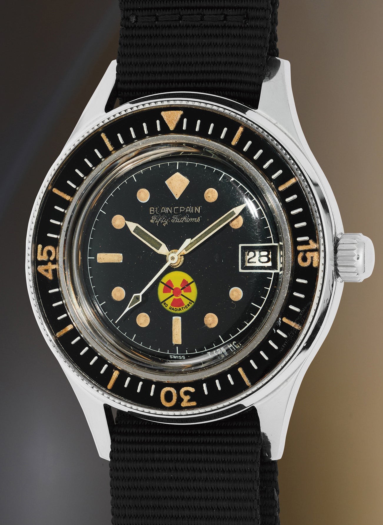 Released in 1953, the Fifty Fathoms was a 41mm diameter dive watch with a rotating Bakelite bezel and luminous markers on the dial and bezel for legibility in the darkness found on deep dives. During the early 1960s, new regulations imposed by governments required changes in luminous materials used. Blancpain complied by using a less radioactive material, and some dials, as seen on the present example, would feature the universal symbol for radioactivity with a cross mark labelled “No Radiation”, giving clear indication to the owner their luminous bezel and dial were harmless. The watch was not sold through luxury boutiques given its practical use, but rather through specialist diving brands and shops.