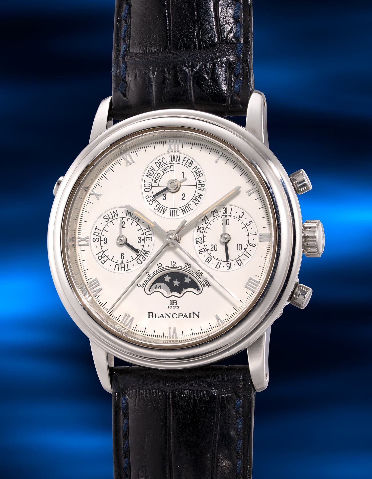 • The present platinum example, bearing production number 12, features a highly legible dial and a discreet split-seconds pusher at 10 o’clock. Offered with a full set of accessories, it remains in excellent overall condition. It is a true collector’s piece from one of the most storied chapters in Blancpain’s history.