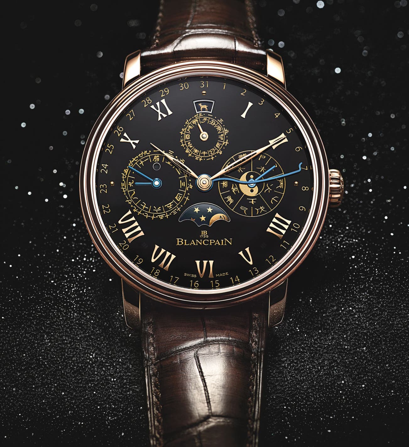 An exclusive horological complication developed by Blancpain, the Traditional Chinese Calendar pays tribute to this culture in this symbolic model based on fundamental principles established for centuries and rooted in Chinese tradition. On its dial, the hours, minutes and the Gregorian calendar rub shoulders with the main indications of the Chinese calendar: traditional double-hour indication, day, month with indication of leap months, signs of the zodiac, as well as the five elements and the 10 celestial stems. The moon phases are also presented and play a particularly important role in this model, given the link between the lunar cycle and traditional Chinese months.