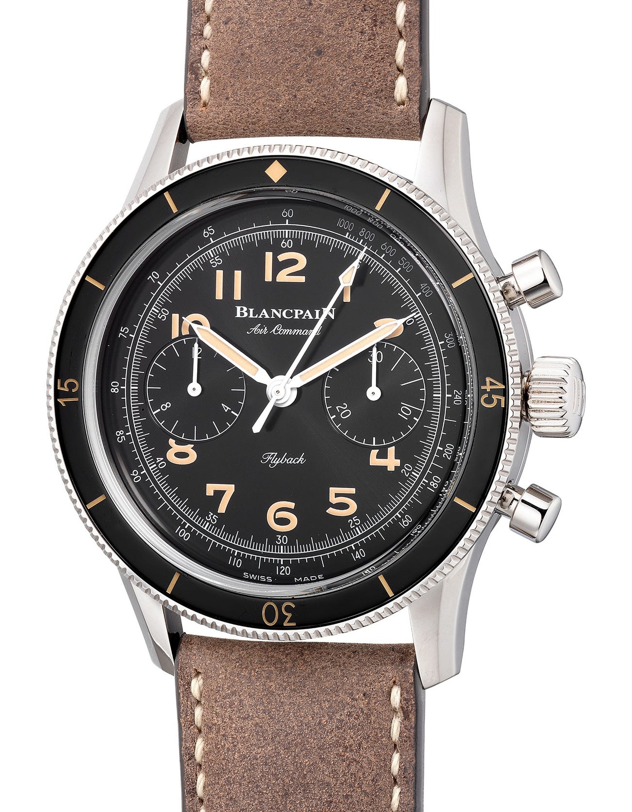 To celebrate the fathomed model, Blancpain introduced a modern iteration of the Air Command in 2019. Extremely well executed, the new model features a slightly larger case at 42.5mm compared to its original 42mm case. Furthermore, the dial is very similar with a contemporized typeface and larger luminous Arabic numerals. To enhance the vintage appeal of the present piece, the luminous Arabic numerals were applied with ecru Super-LumiNova to achieve the aged patinated effect. Whilst the original from the 1950’s featured a black acrylic bezel insert, the new opted for a durable ceramic bezel insert with luminous counters.