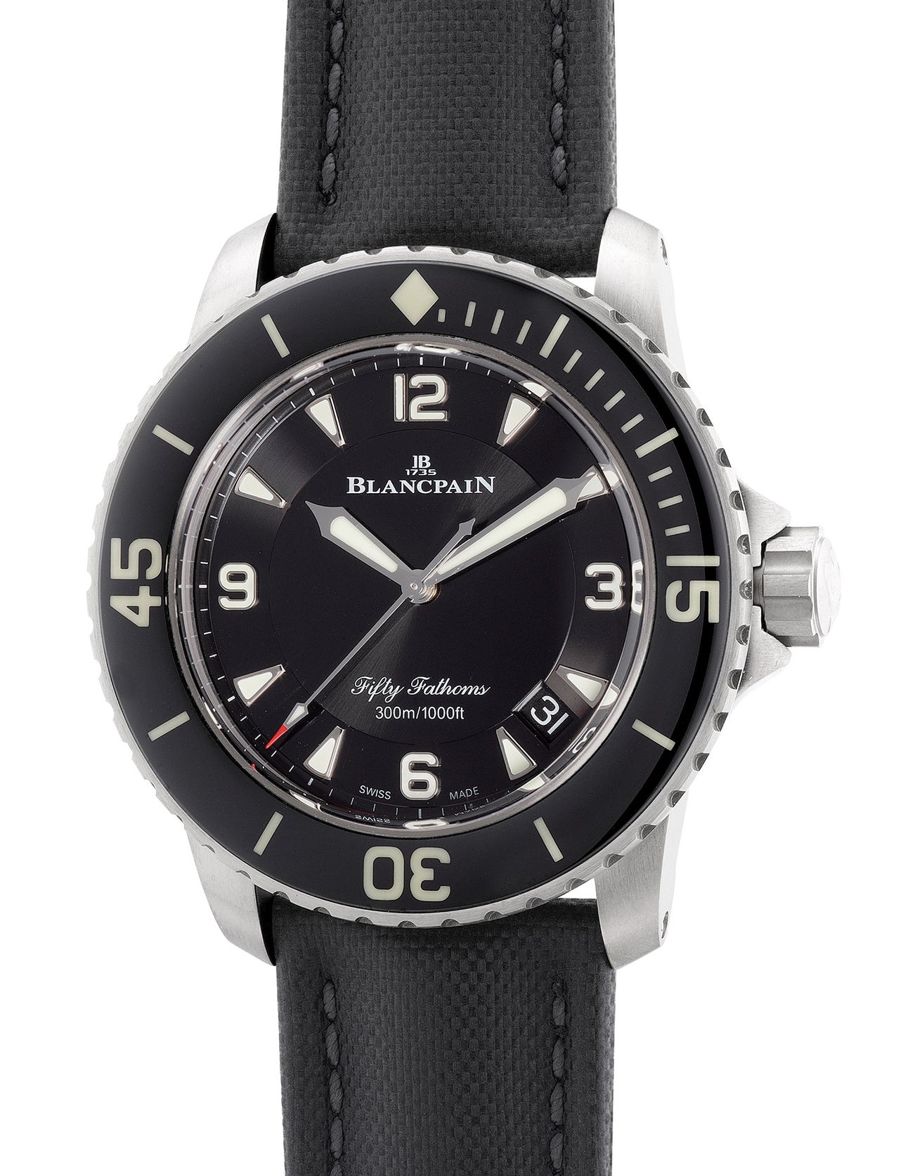 In 2014, Blancpain launched the Fifty Fathoms 5015 encased in titanium with an all sapphire crystal luminous bezel insert. Providing durability, the nature of the sapphire crystal ensures a tougher hardness while retaining a vintage aura. Whilst Fifty Fathoms is equivalent to 100 meters, the present example boasts a depth rating of up to 300 meters.