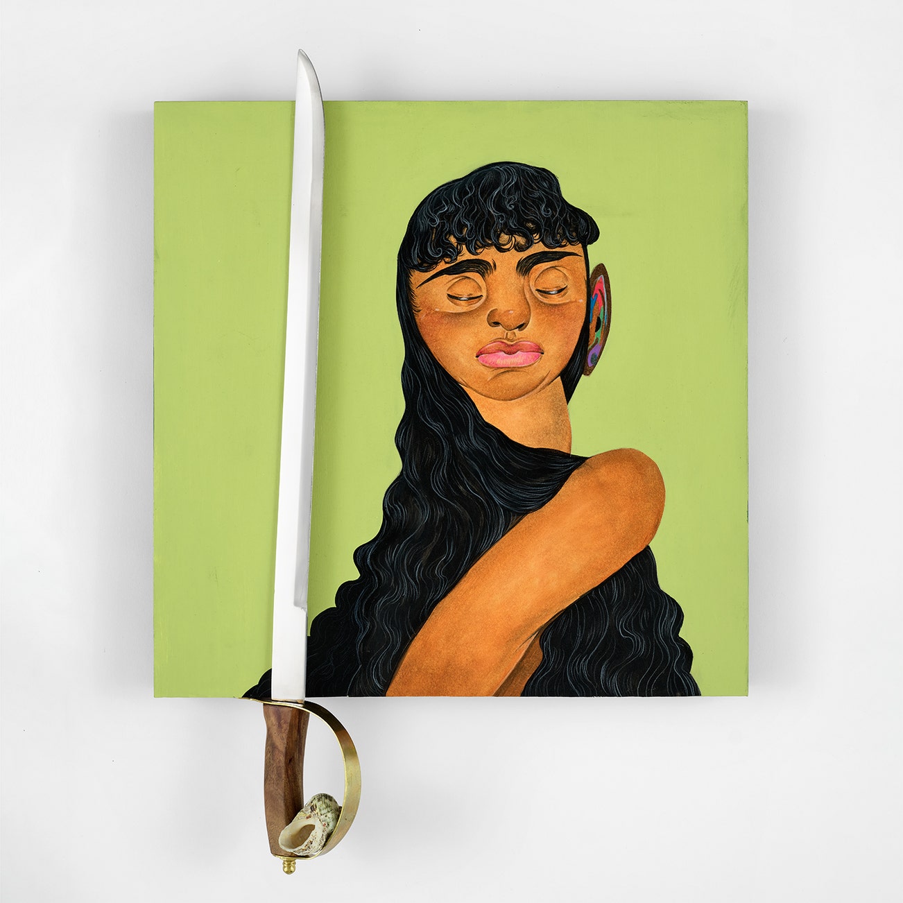 acrylic, coloured pencil, oil pastel, metal & wood sword, seashells, and Bristol paper on wood panel