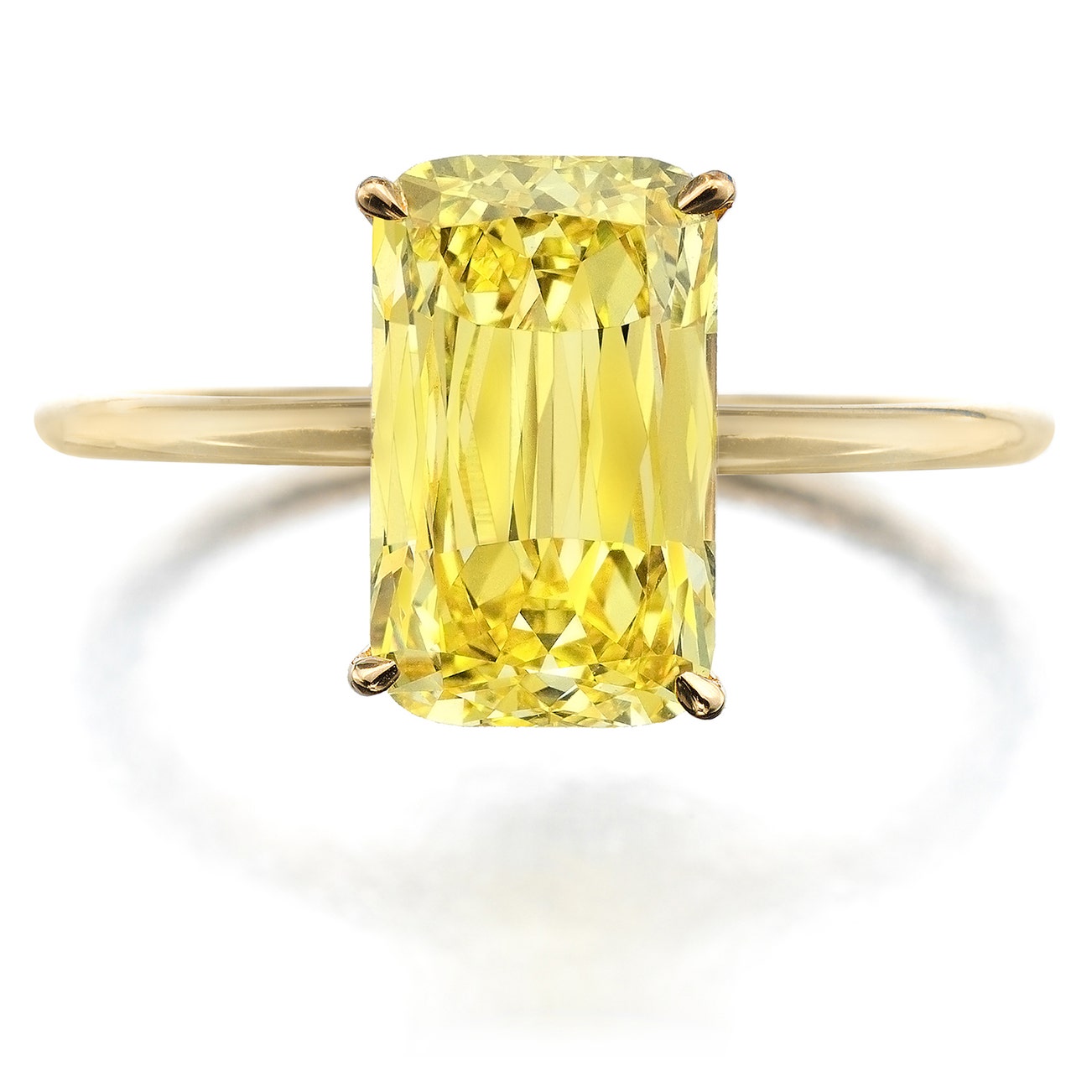 Set with a round-cornered rectangular modified brilliant-cut fancy vivid yellow diamond weighing 2.49 carats, mounted in 18k yellow gold, size 6.25.