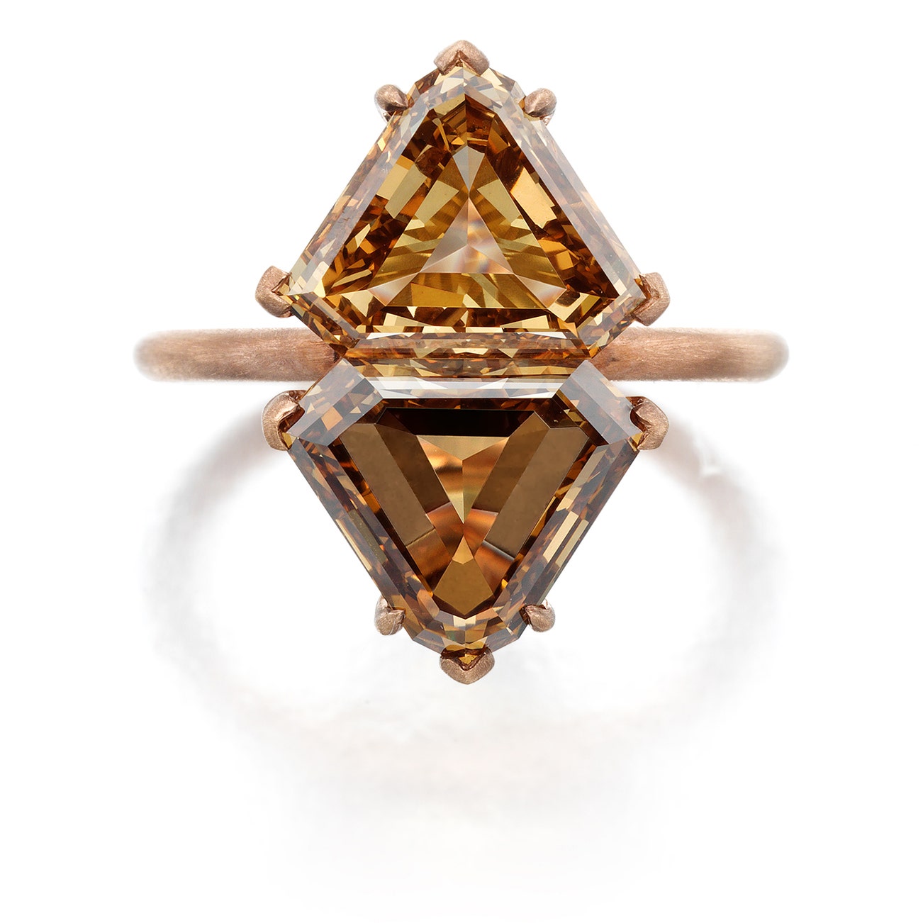 Set with two modified shield step-cut fancy yellow-brown diamonds weighing 3.11 carats and 3.02 carats respectively, mounted in 18k rose gold, size 6.25.