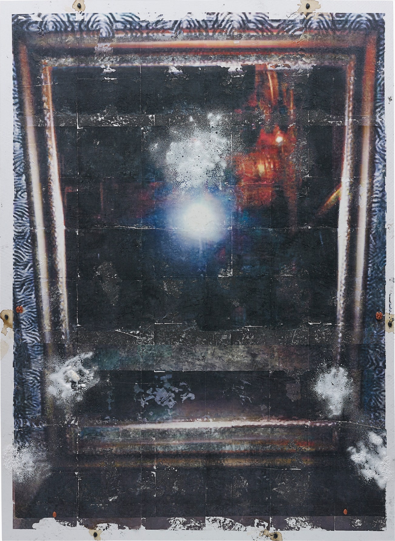 thermal transfer, baking soda, walnuts, pistachio shell, coffee, enamel on canvas