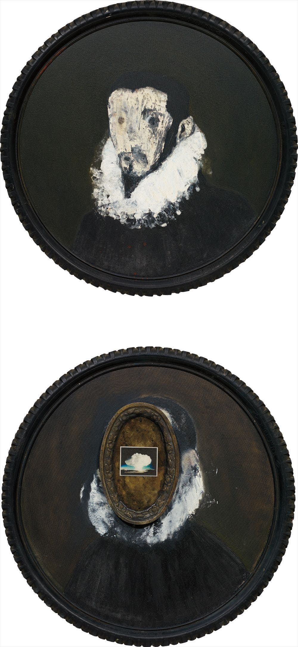 oil, metal dish and photo collage on canvas, laid on board, with bicycle wheel frames, dyptich