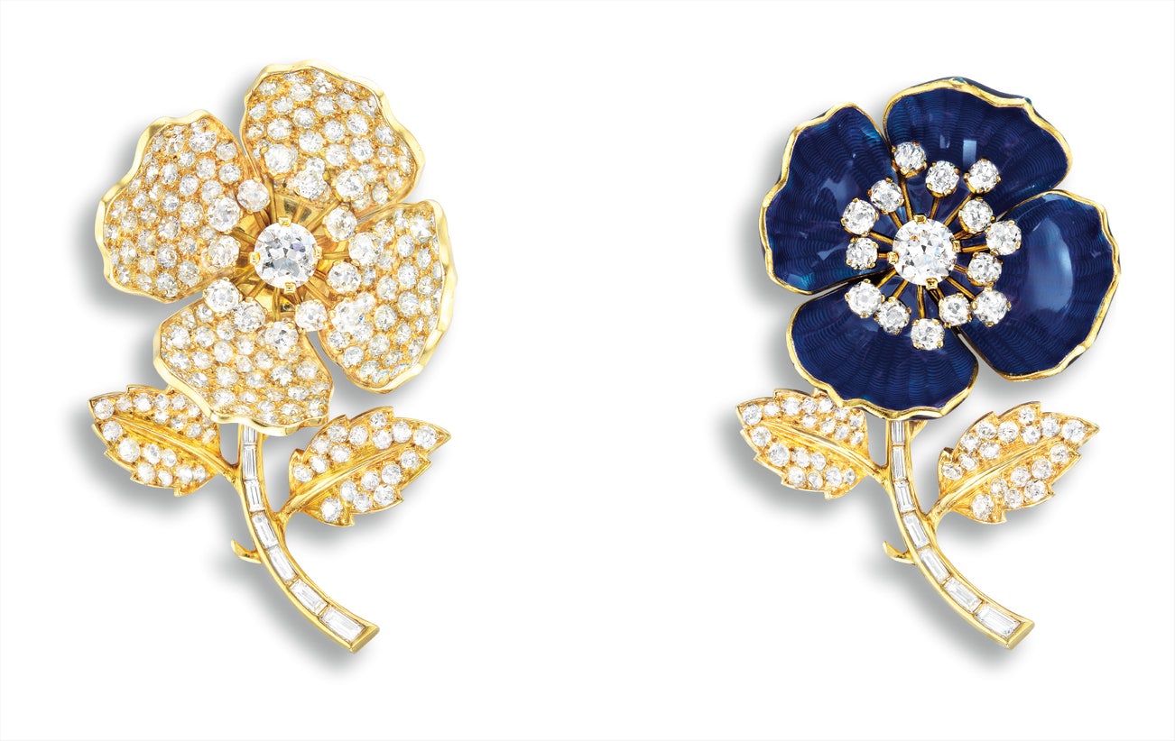 The present brooch designed as a brilliant-cut diamond flowerhead and pistils together with an interchangeable blue guilloche enamel petals to the baguette-cut diamond leaves and stem truly represent beautiful and sensual designs in the 1950s from the House of Boucheron. The timeless style of elegant and wearable jewels has lasted the test of time and remain very much in fashion today.