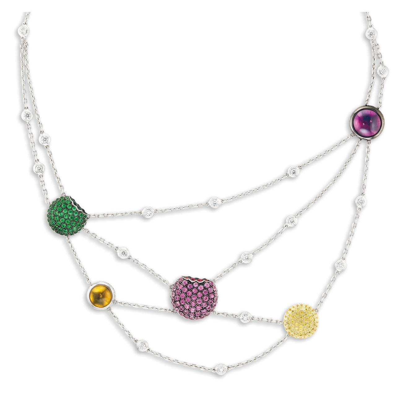 Set with one cabochon amethyst, one cabochon citrine, and numerous tsavorite garnets, pink and yellow sapphiresBrilliant-cut diamonds on link chain, totalling approximately 1.70 carats18 karat white gold<em>With a signed necklace box </em>