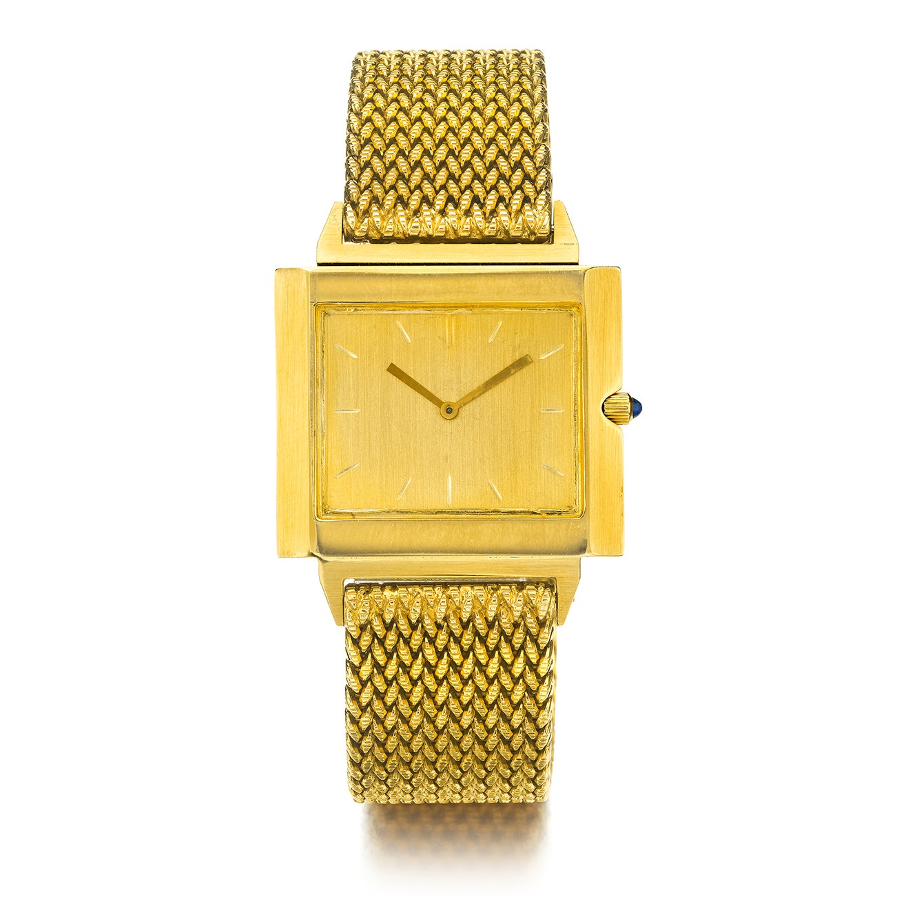 The square dial and gold case accented by a gold mesh bracelet, mounted in 18k yellow gold, inner circumference approximately 6 1/4 inches, signed Boucheron, numbered, French assay marks for 18k gold and maker's mark, signed pouch.