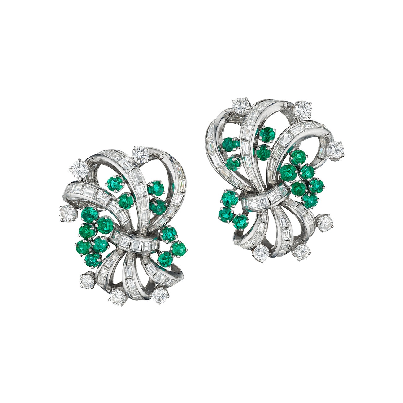 Each clip designed as a baguette and carré-cut diamond-set spray, accented by brilliant-cut diamonds and circular-cut emeralds, mounted in 18K white gold, each signed Boucheron Paris, numbered, French assay marks and maker's mark, clip back fittings.