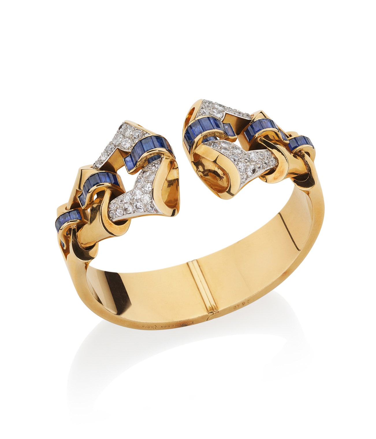 Set with calibré-cut sapphires, accented with brilliant-cut diamonds, inner circumference approximately 150mm, signed Boucheron, numbered.