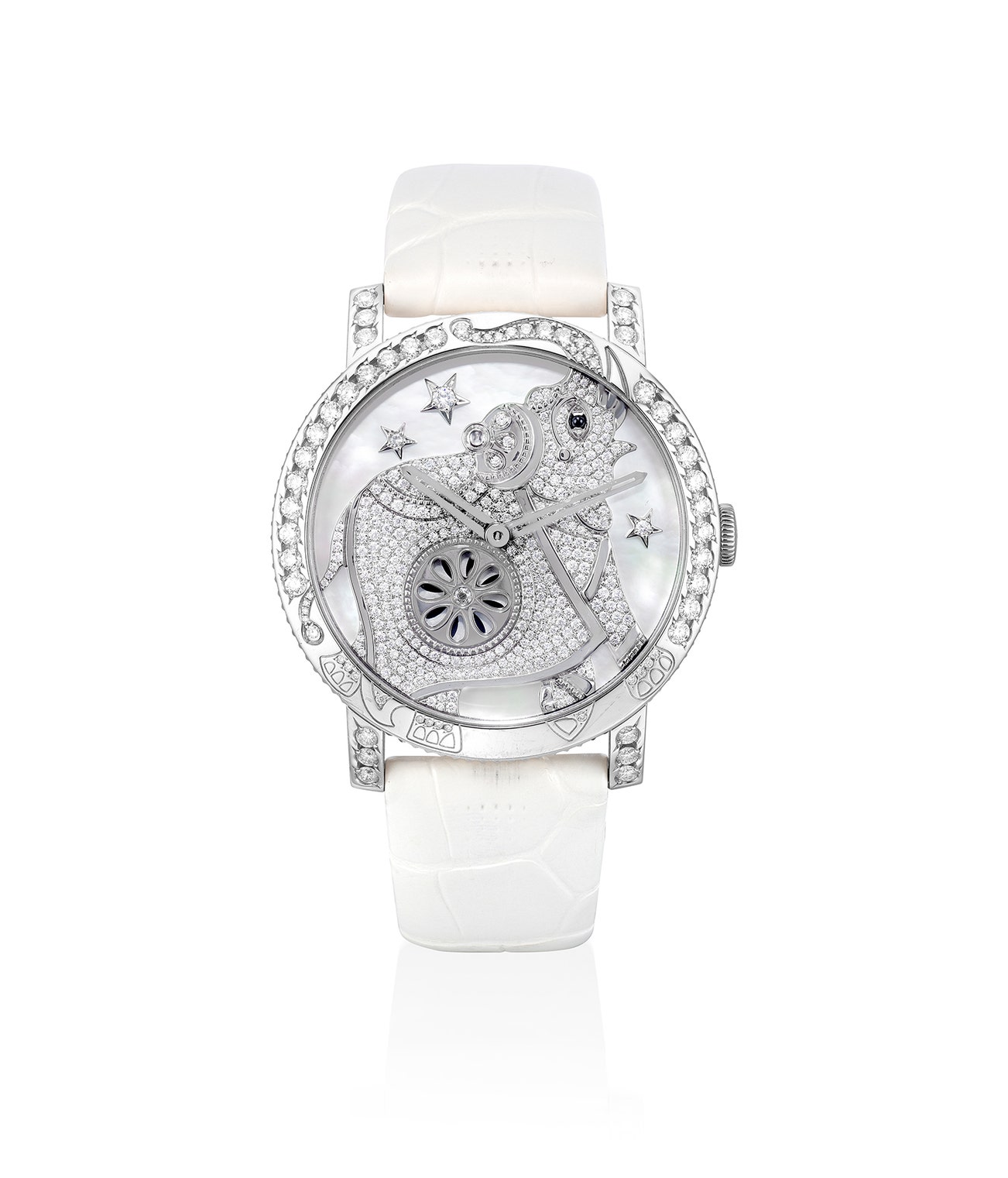 With automatic movement, mother-of-pearl dial decorated with an elephant and star motifs set with brilliant- and circular-cut diamonds, and an onyx eye, with small disc with petal-shaped apertures for seconds, steel hands, in a round case with bezel decorated with circular-cut diamonds, with white Boucheron alligator strap and buckle, mounted in white gold, case, strap and buckle signed Boucheron, numbered, Swiss assay mark, maker’s mark, case width approximately 42 mm, case stamped Boucheron.