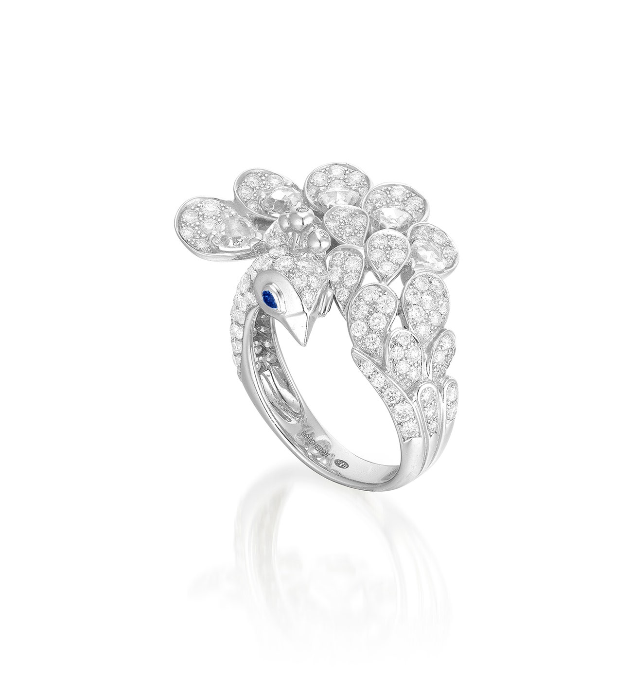 Designed as a peacock, set with brilliant-cut and pear shaped rose-cut diamonds, accented by sapphire-set eyes, mounted in white gold, signed Boucheron, numbered, with Swiss assay mark, maker’s mark, size 6¼, case stamped Boucheron.
