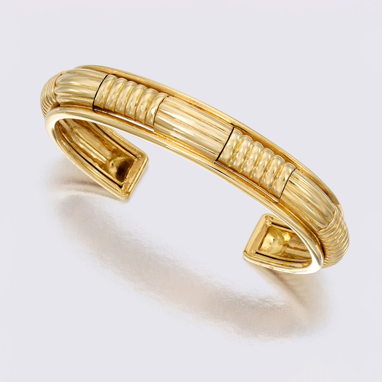 Of ribbed cuff design, mounted in 18K yellow gold, inner circumference approximately 6 1/2 inches, signed Boucheron, numbered, with French assay mark and maker's mark.