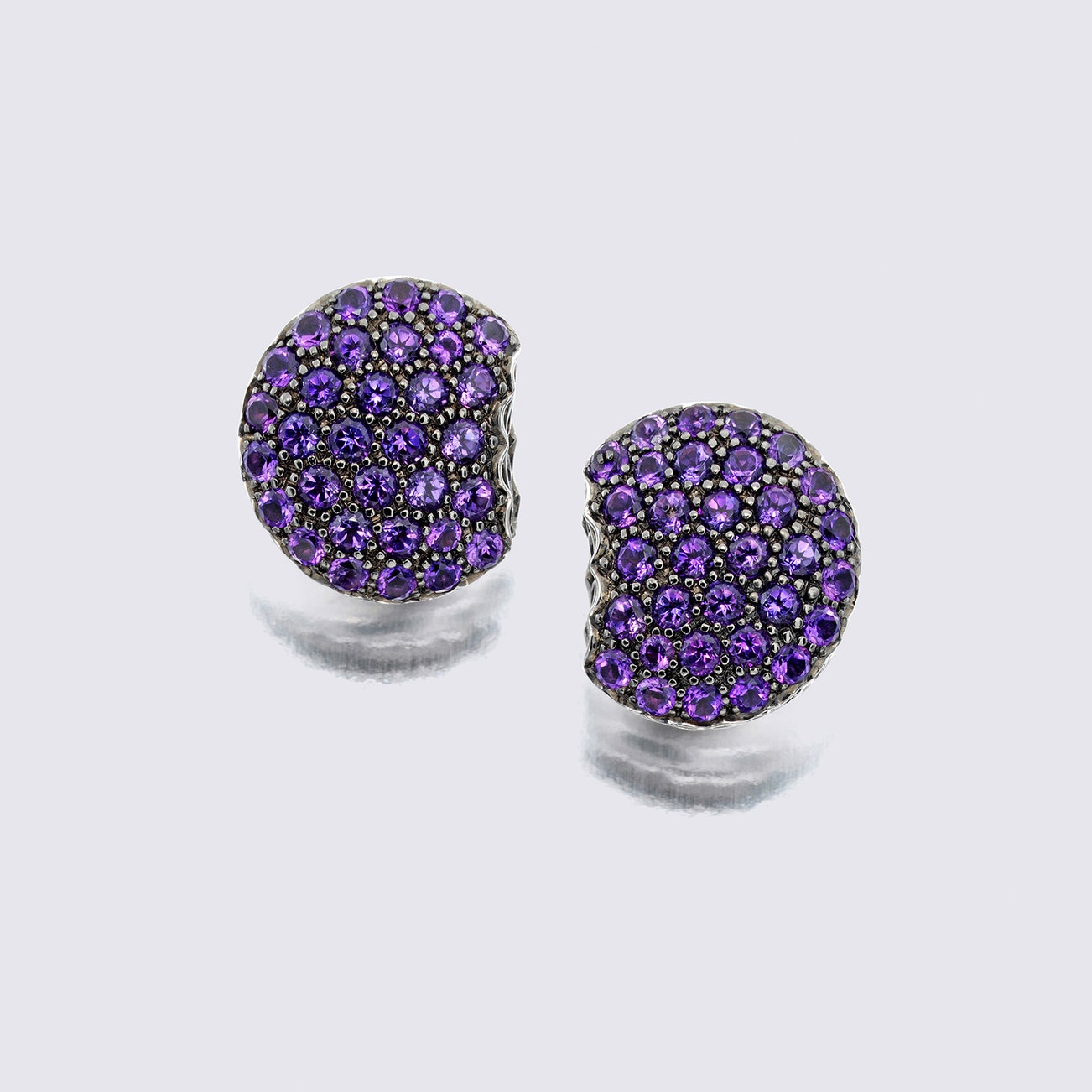 Pavé set round-shaped amethysts, mounted in 18K rhodium plated gold and white gold, length approximately 1/2 inch, signed Boucheron, numbered, with maker's mark, post back fittings.
