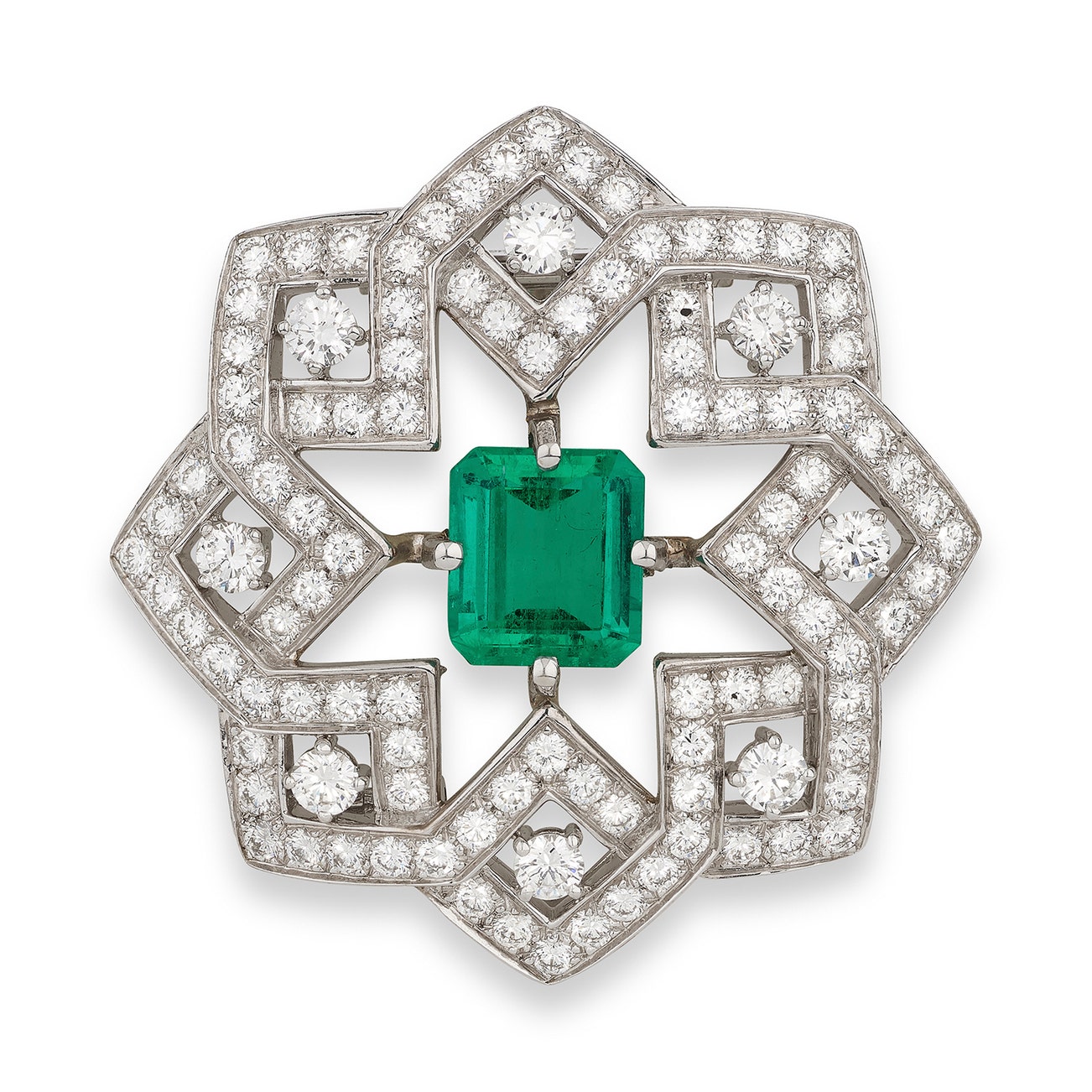 Designed as a stylised star, set with a step-cut emerald weighing 3.51 carats, highlighted with brilliant-cut diamonds, measuring approximately 40 x 40mm, signed Boucheron, numbered, French maker's mark for Boucheron and assay mark for gold.