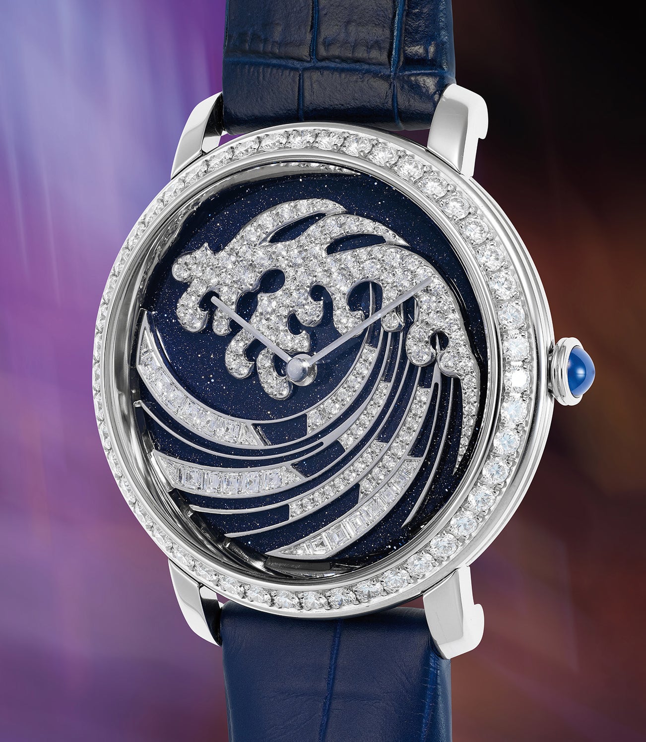 A unique and bedazzling white gold wristwatch with three-dimensional diamond-set and aventurine glass display