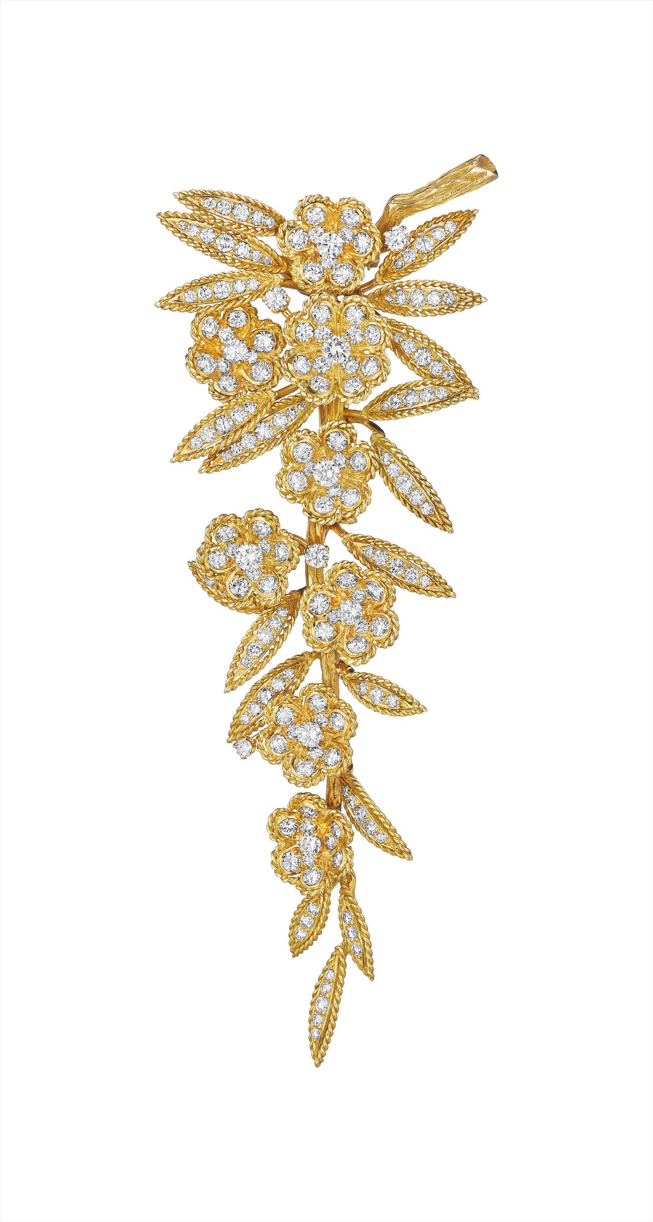 Designed as a highly flexible graduated line of circular-cut diamond florets, extending circular-cut diamond leaves, mounted in 18K yellow gold, length 4 3/4 inches.