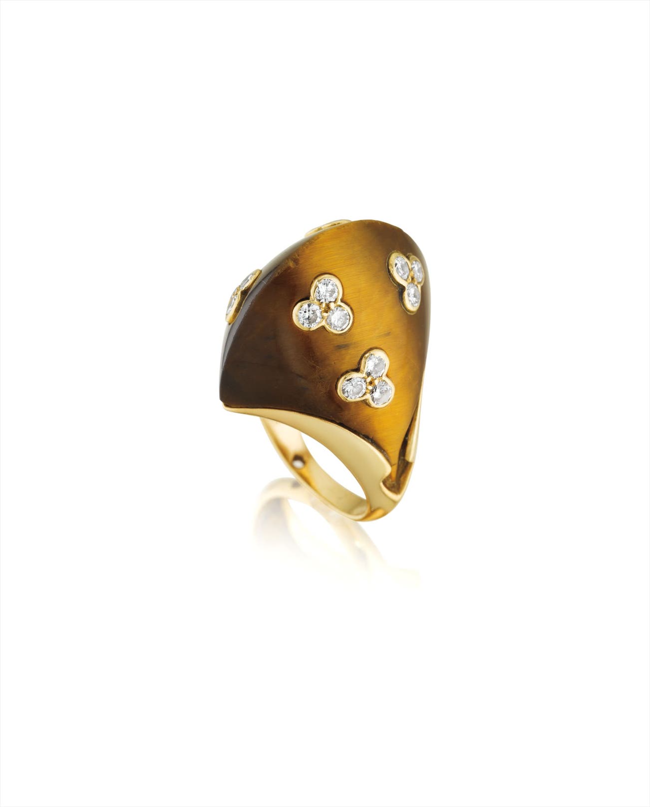 Designed as a carved dome tiger's eye ring, enhanced by circular-cut diamond accents, mounted in 18K yellow gold, size 6.