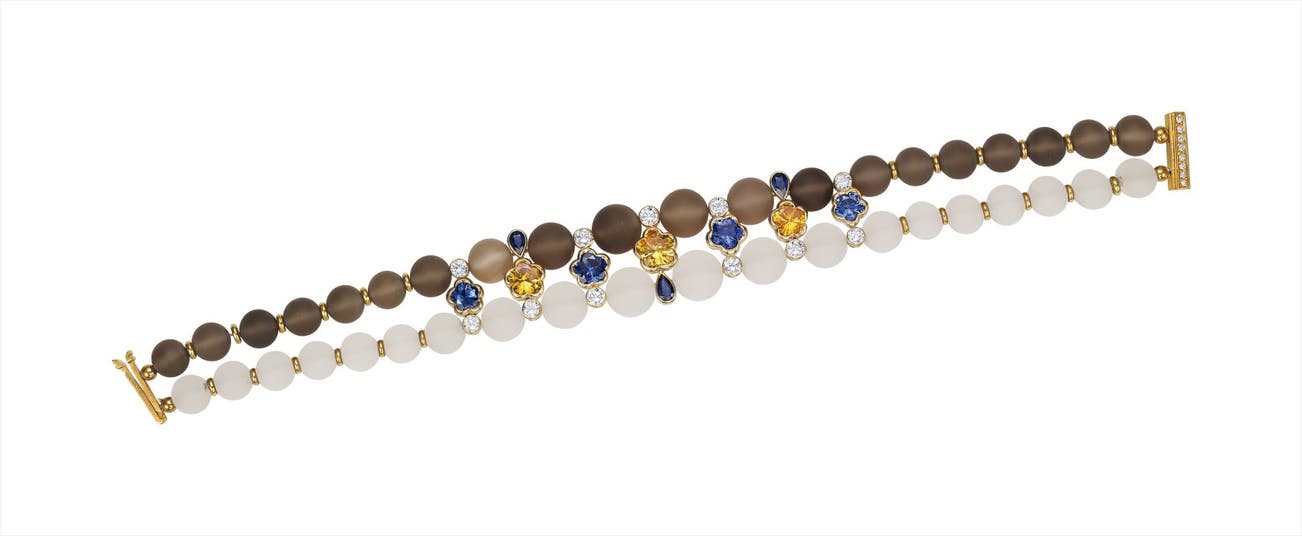 Designed as two lines of frosted rock crystal and smoky quartz beads, centering on polished gold connector links enhanced by circular-cut diamonds, marquise-cut sapphires, and circular-cut yellow and blue sapphires within scalloped collets, mounted in 18K yellow gold, length 7 3/4.