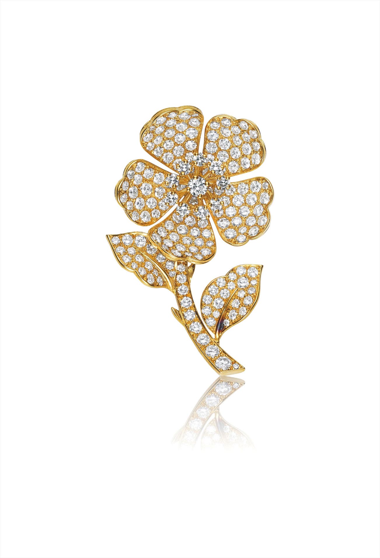 Designed as a flower set entirely with circular-cut diamonds, centering on a detachable diamond cluster, with interchangeable ruby cluster, mounted in 18K yellow gold, length 2 inches.