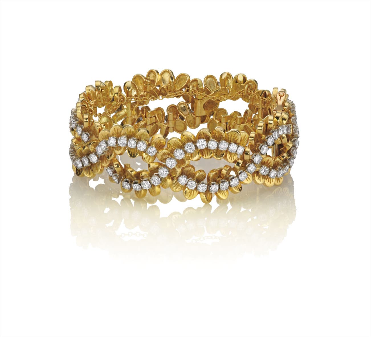Designed as two undulating textured gold lines of foliate motif, enhanced by circular-cut diamonds, mounted in 18K yellow gold and platinum, length 6 3/4 inches.