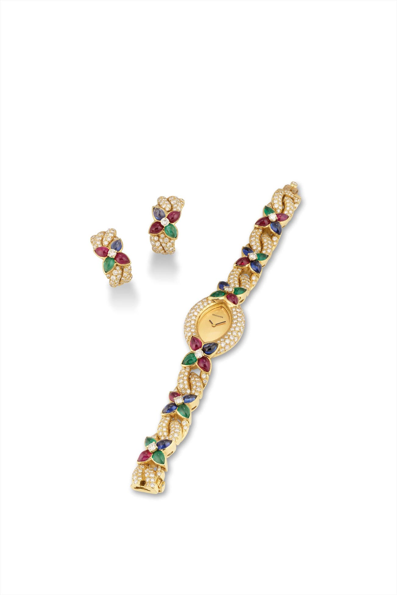 Manufactured in the 1990s, this Boucheron suite consists of a bracelet watch and earrings and are offered in excellent overall condition. Cased in yellow gold, the watch and earrings are set with different sizes of multi-gems including diamonds, sapphires, rubies and emeralds. It is certainly a delightful and eye-catching piece when worn in a formal occasion.