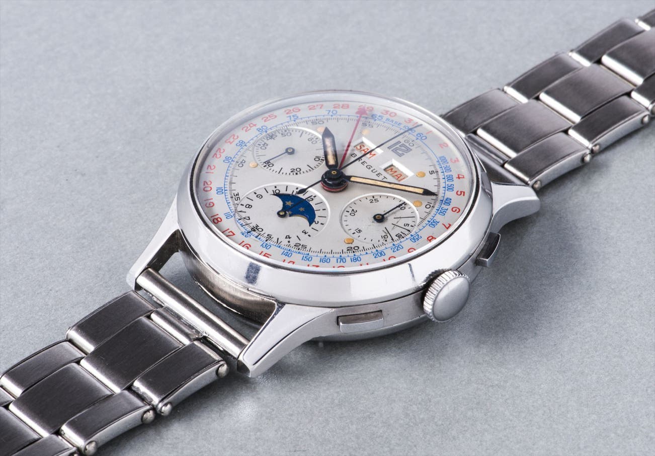 Manufactured in 1948, and sold to M. Milleret in Paris on September 4, 1952, this unusual and beautiful Breguet timepiece shares a similar movement to Rolex’s Dato Compax model, also known as the “Jean-Claude Killy”. While the Rolex models featured a Valjoux 72C caliber, Breguet used the Valjoux caliber 88, which is a modified 72C caliber with additional moonphase complication. The purity and equilibrium of the dial also draws comparison to other horological greats, where a keen observer can see similarities to Patek Philippe’s iconic 1518 and 2499 references.