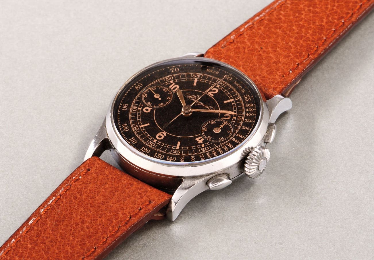 For a watch like this to have survived over 70 years with no signs of restorations is remarkable. The stainless steel case, with its original crown and olive-shaped pushers, remains crisp and in overall excellent condition, illustrating how carefully its past owner wore and preserved it. This watch comes accompanied with a certificate from Breguet confirming the authenticity of this watch, and indicating that it was in fact sold on June 10, 1939 for 2,800 FFR. One of the earliest examples of a Breguet chronograph wristwatch, together with its superb overall condition makes this a unique opportunity for collectors of vintage steel chronographs.