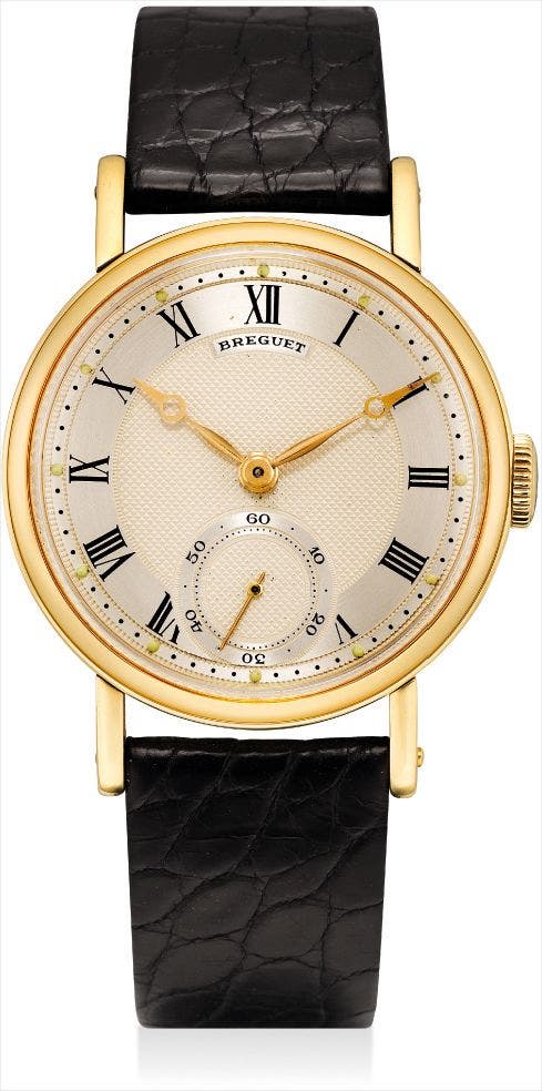 It was very rare for Breguet to produce fine yellow gold watches during the war years. Research suggests that no more than a few dozen yellow gold wristwatches left the Breguet factory during this period. In contrast, the market has seen a number of 'Type XX' chronographs, which is fitting since many time pieces during the 1940s and 1950s were produced for specific, military purposes.The dial is finely engine-turned and features black Roman numerals on a polished chapter ring that captures the classic Breguet look. 'Pomme' hands furthermore finish off the watch, which today is a defining feature of Breguet's production line.