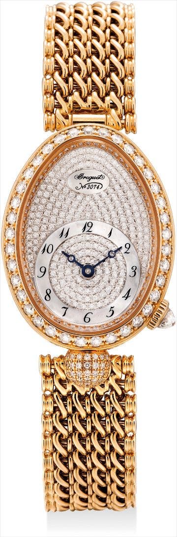 A lady's fine and rare pink gold and diamond-set oval bracelet watch with pavé-set diamond and mother-of-pearl dial