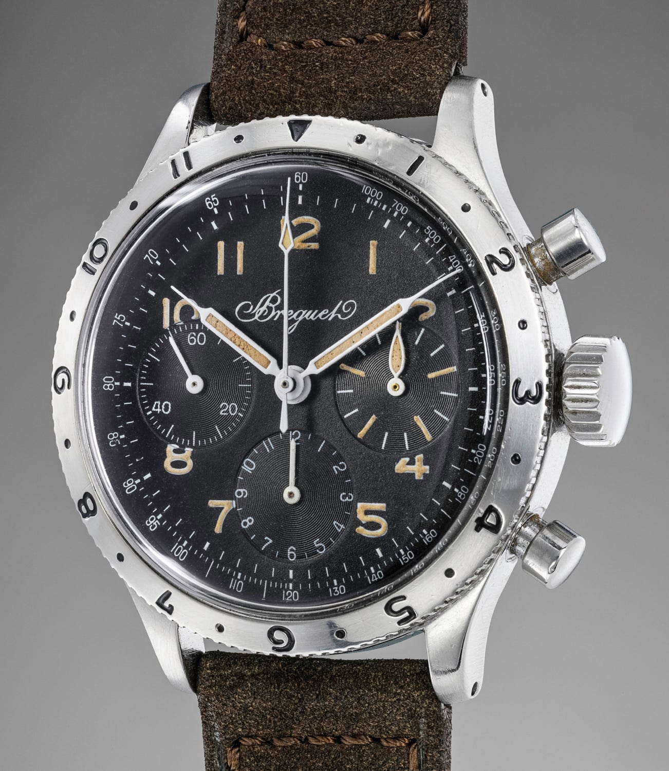 The present piece features one of the least commonly seen and most aesthetically striking details to ever appear on this model: a tachymeter scale. Research of the piece with the Breguet Archives discovered that the watch was sold on July 16, 1965 to M. Ducharne for 538 French Francs. Furthermore, it appears that precisely during those years (1965-1970), Breguet supplied such tachymeter dials on special request. This leads us to believe that, most probably, the present timepiece was issued after a special request of Mr. Ducharne, making it one of the most appealing and rare Type XX to be offered for sale in recent years.