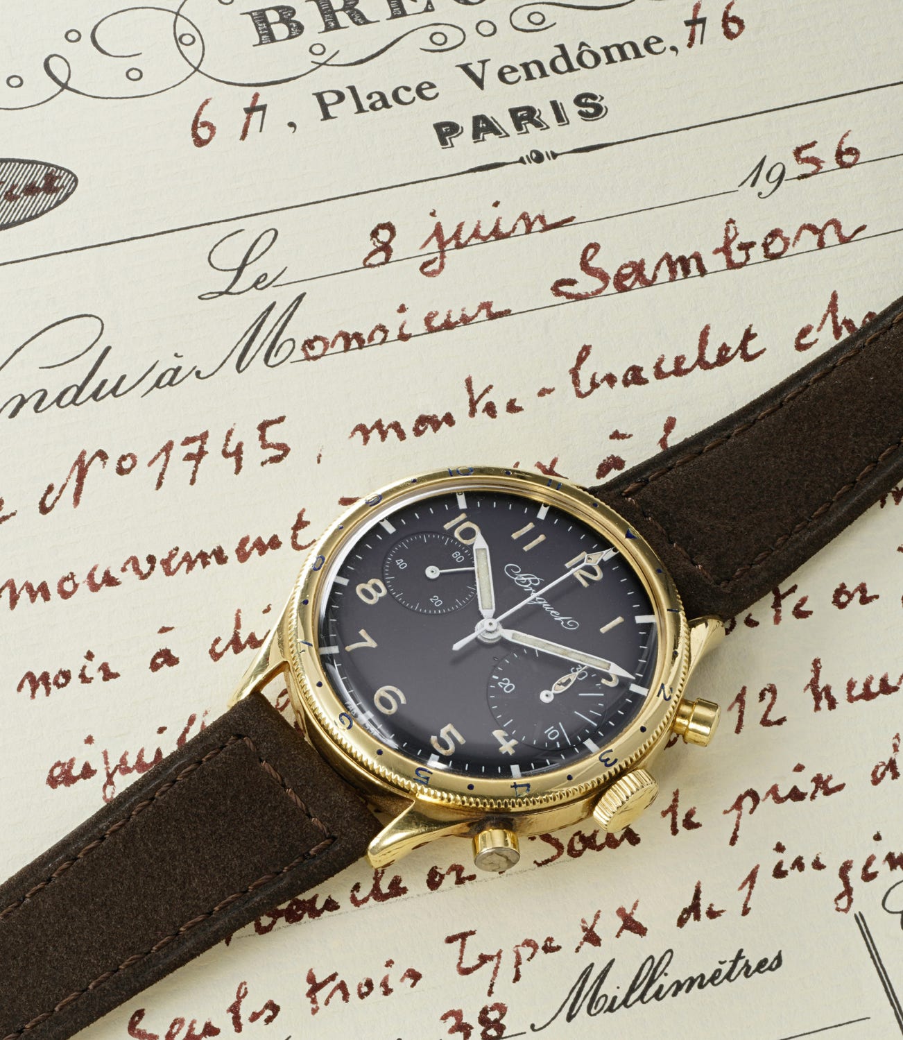 While the military examples were manufactured in stainless steel, the present, extremely rare, yellow gold example is one of only three known made in 1955 as confirmed by the Breguet Certificate accompanying this watch. According to Breguet’s archives, the watch was sold on June 8, 1956 to M. Sambon for the extraordinary price of 115,000 French Francs. A second known example is exhibited in the Breguet Museum in Paris. While their exact use remains unknown, it is unlikely an 18k gold timepiece would have fared well in a harsh military environment. Considering the high price when originally sold it is was therefore likely a special and exclusive edition for a very select clientele.