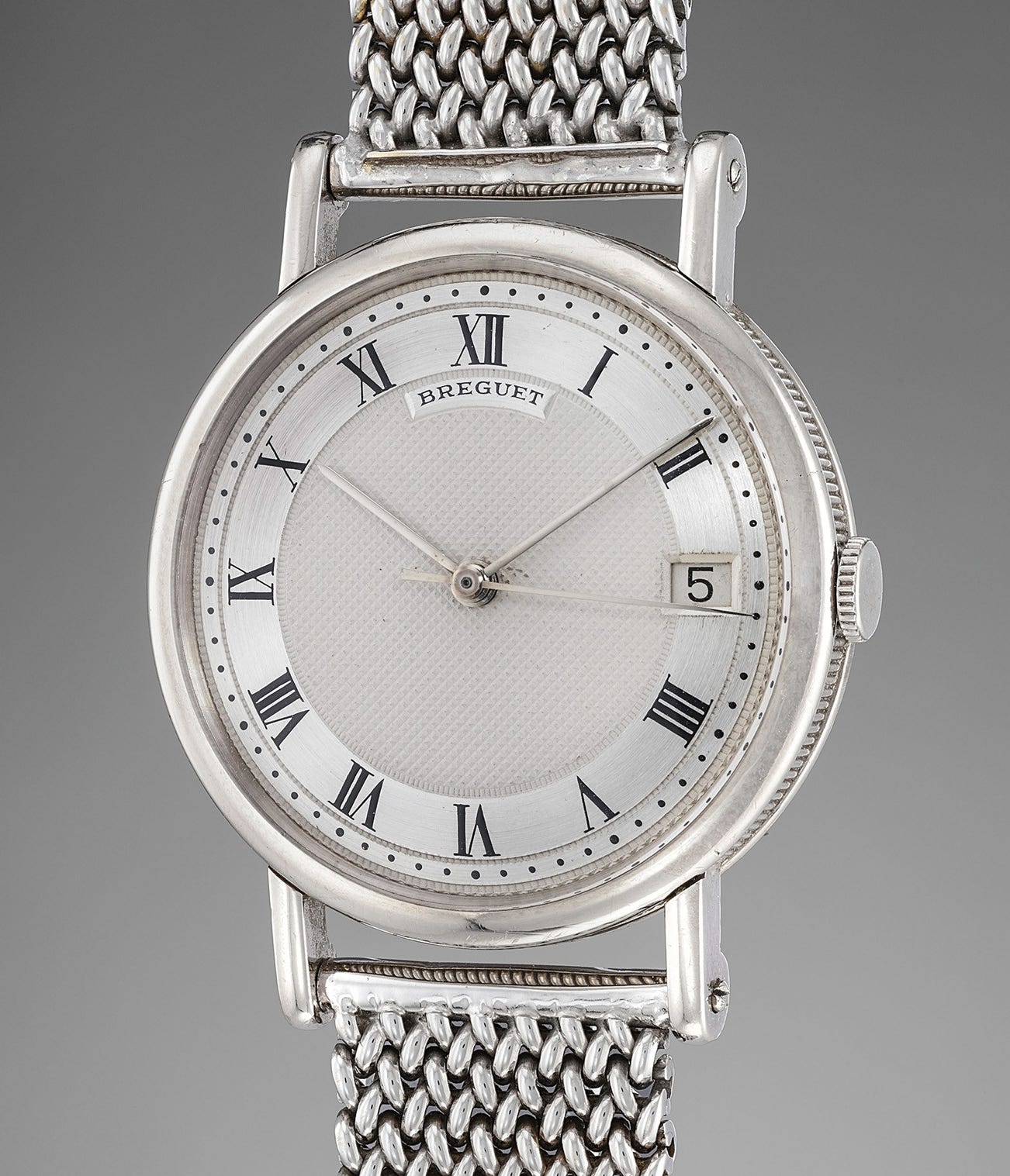 The present model from 1968 features the design codes originally set out by the great Abraham-Louis Breguet over 200 years before, such as the coin edges of the case and the typical guilloche dial. However, what the biggest surprises in the present model are the straight baton hands instead of the typical Breguet hands, and the date window located at 6 o’clock, something rarely seen in the company’s dress watches at the time.