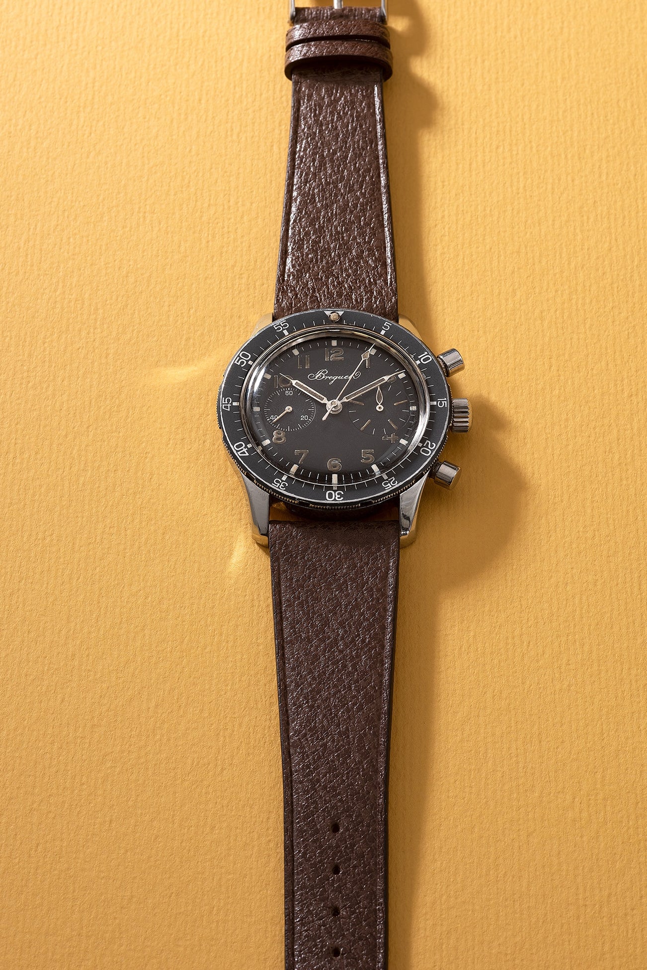 The present timepiece is an outstanding example of this highly coveted watch model. The watch is preserved in overall excellent condition, showing the extensive level of care and attention from its original owner. The watch is also accompanied with an official attestation from Breguet, confirming production of the present watch in 1971 and its subsequent sale on June 12, 1972. For enthusiasts of fine fly-back chronograph wristwatches, this Breguet is an extremely rare treasure that is certain to amaze.