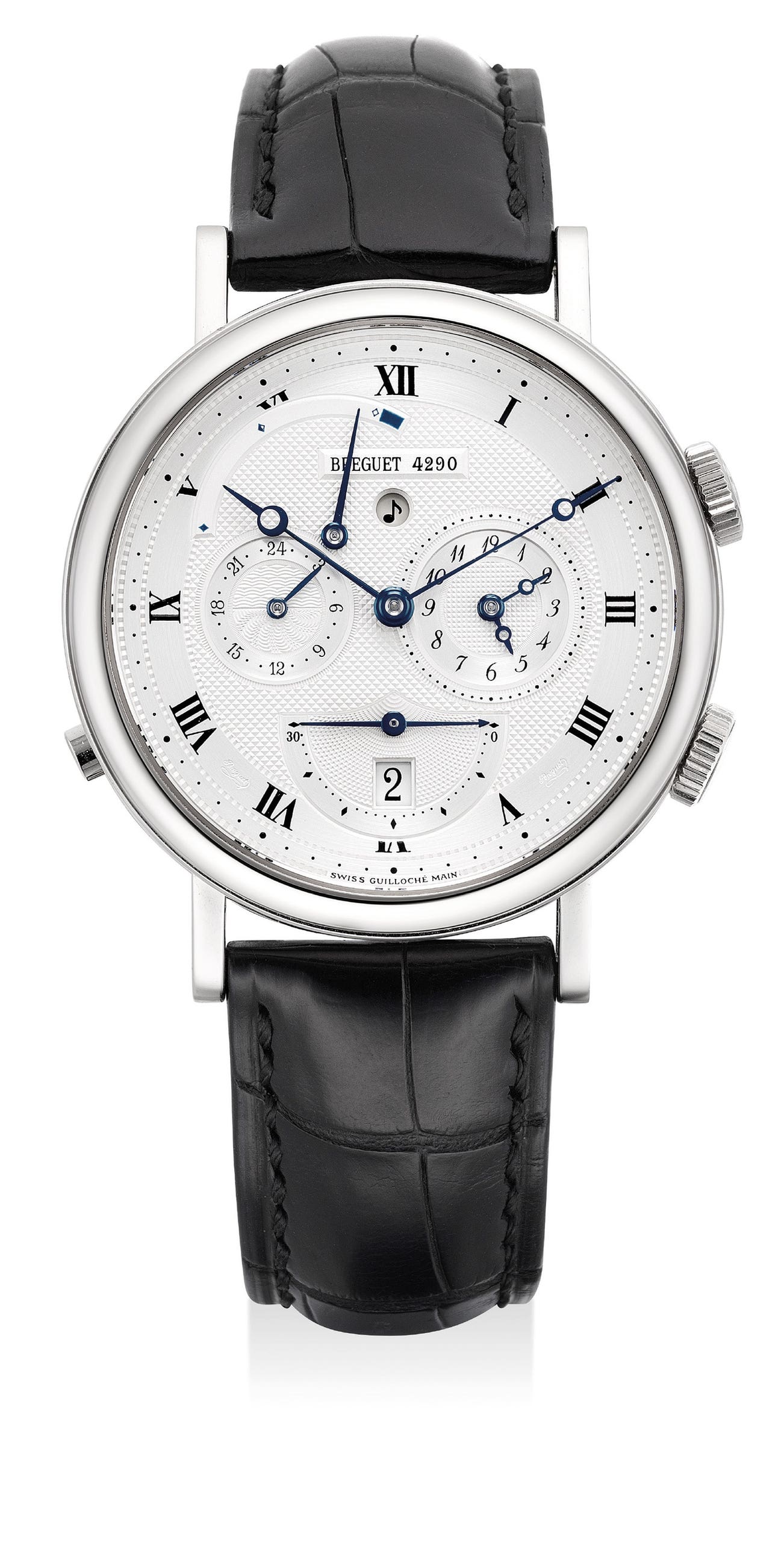 A fine and attractive white gold dual time wristwatch with alarm, 24-hours, power reserve indication and guilloche dial