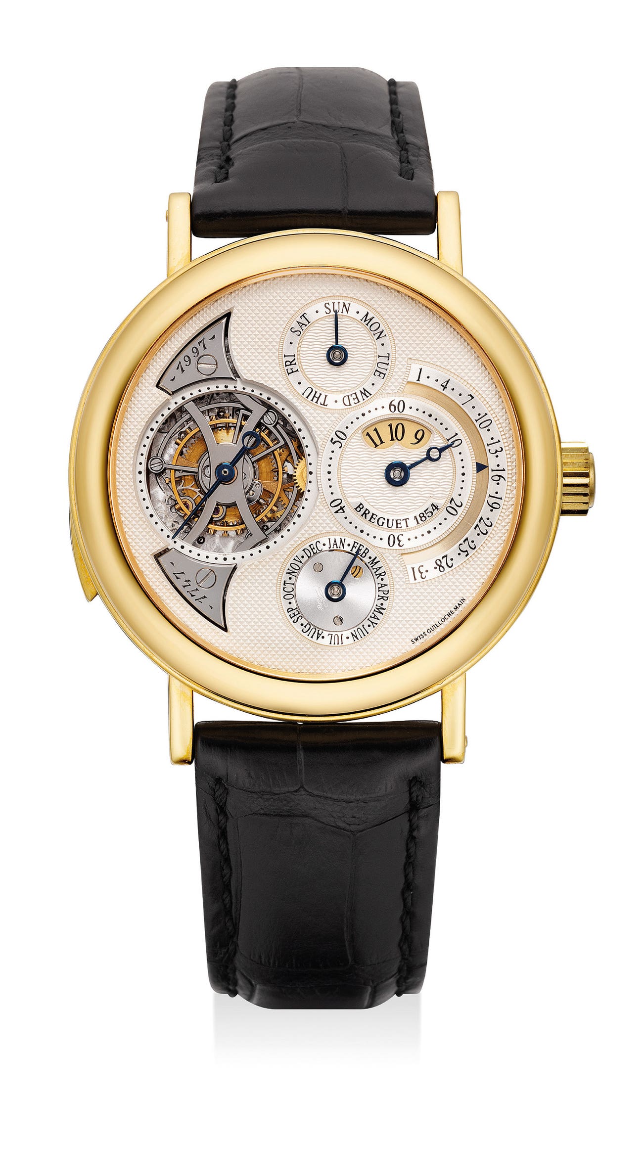 The present example of a Breguet ref. 3857 in yellow gold is an exciting specimen combining three important complications developed and initially patented by the firm. Complete with the original certificate from Breguet and fitted presentation box, this present example is a fantastic opportunity for collectors of complicated watches to acquire a piece horological art by one of the oldest manufacturers in the industry.