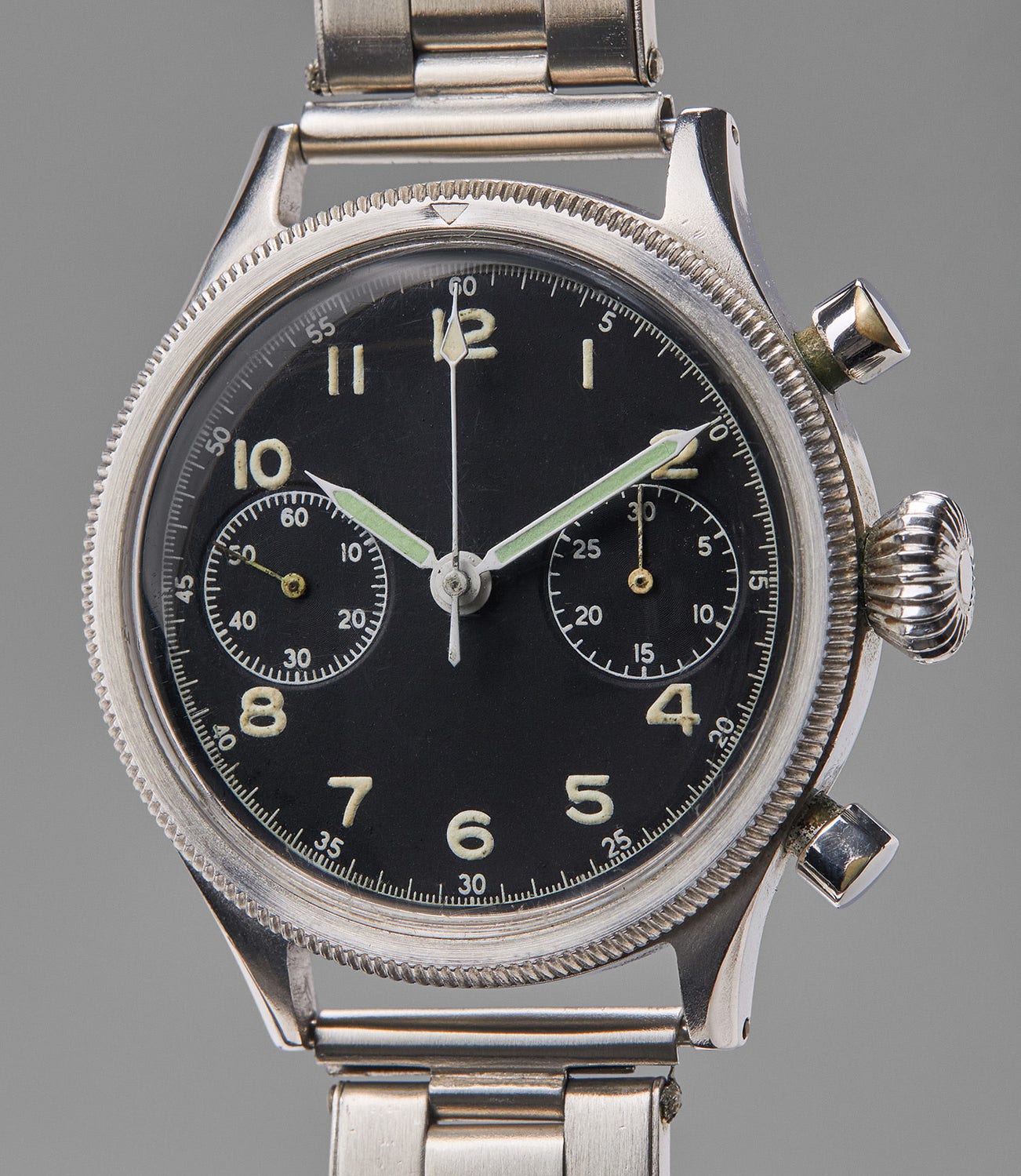 A very rare and highly attractive stainless steel military flyback chronograph wristwatch with black dial, sold to benefit the Institute for Digital Archaeology