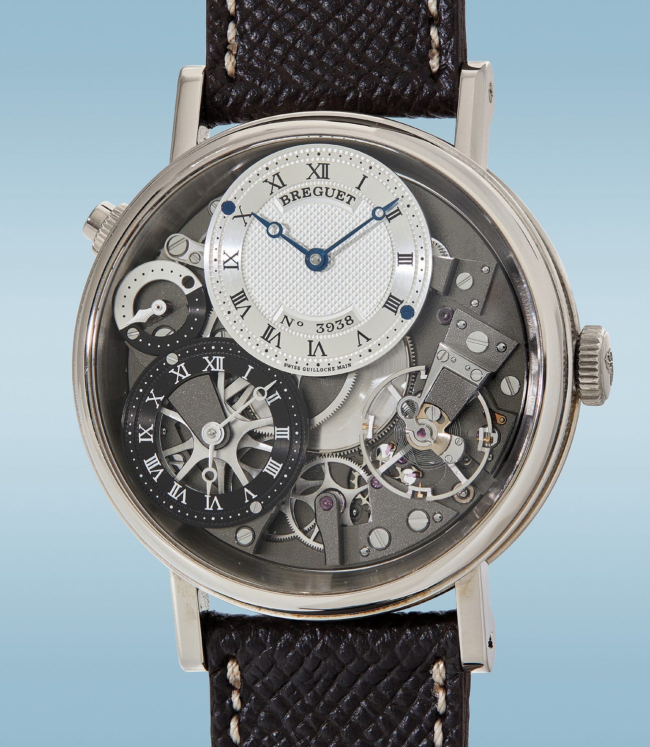 A hallmark of Breguet timepieces is the guilloché silvered dial with classic blued steel Breguet hands. The movement is fully visible below, with a day/night indicator at 10 o’clock, and a blackened subsidiary dial indicating the second time zone at 8 o’clock. The 40mm diameter case has extended straight lugs, with a pusher at 10 o’clock for ease of setting the second time zone.